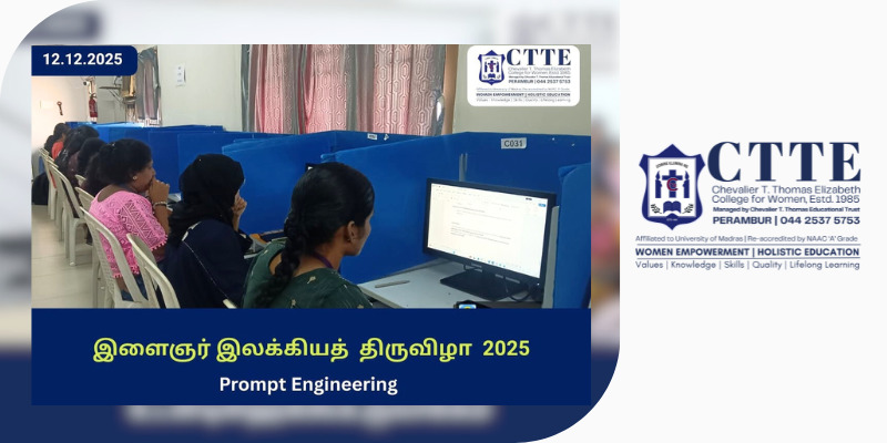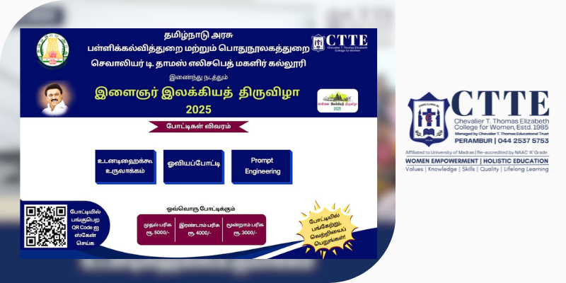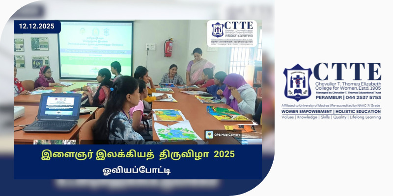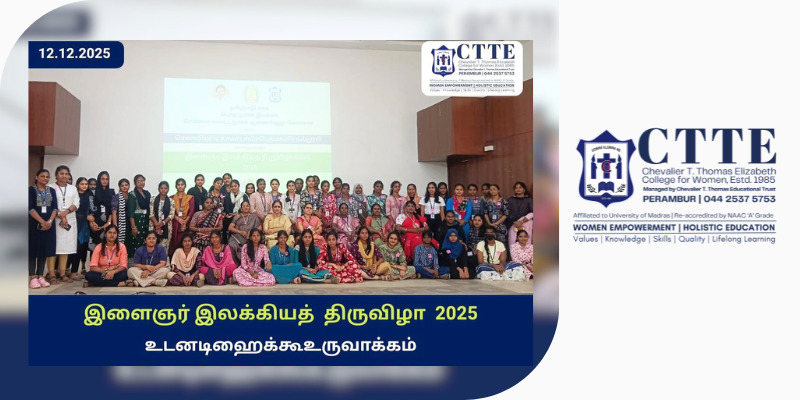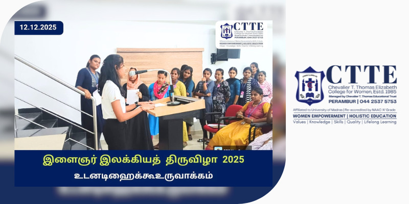 The Youth Literary Festival 2025 was organised at CTTE College for Women in collaboration with the Public Welfare Department of the Government of Tamil Nadu, with a focus on promoting creativity, traditional knowledge, and intellectual engagement among students.